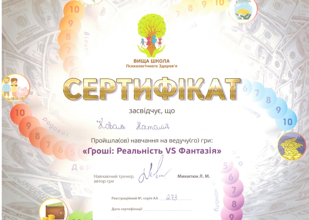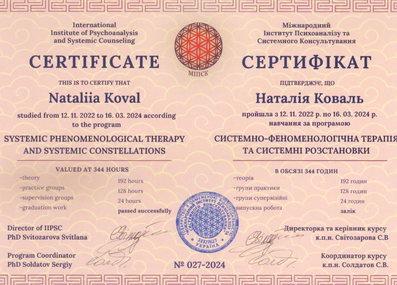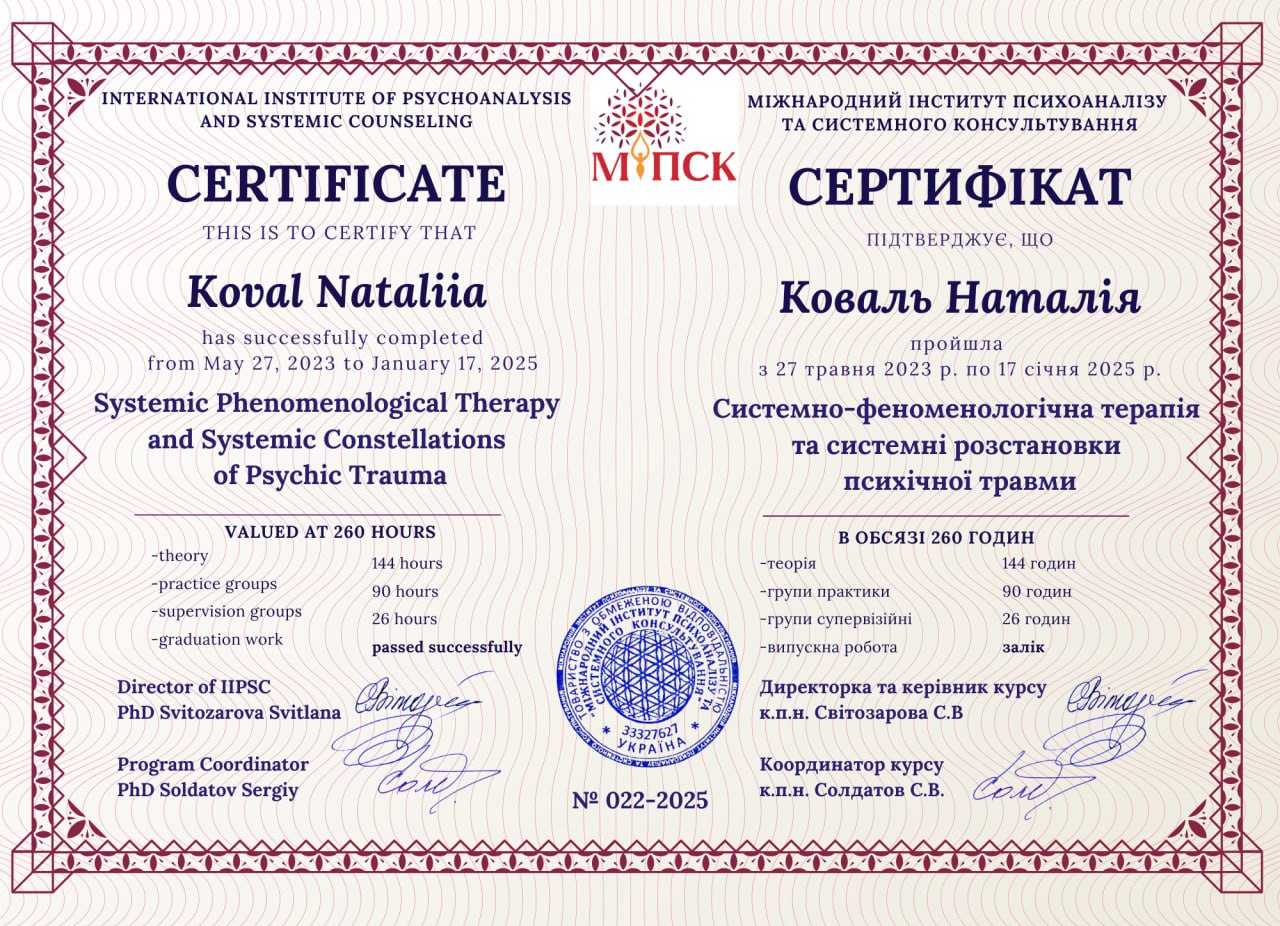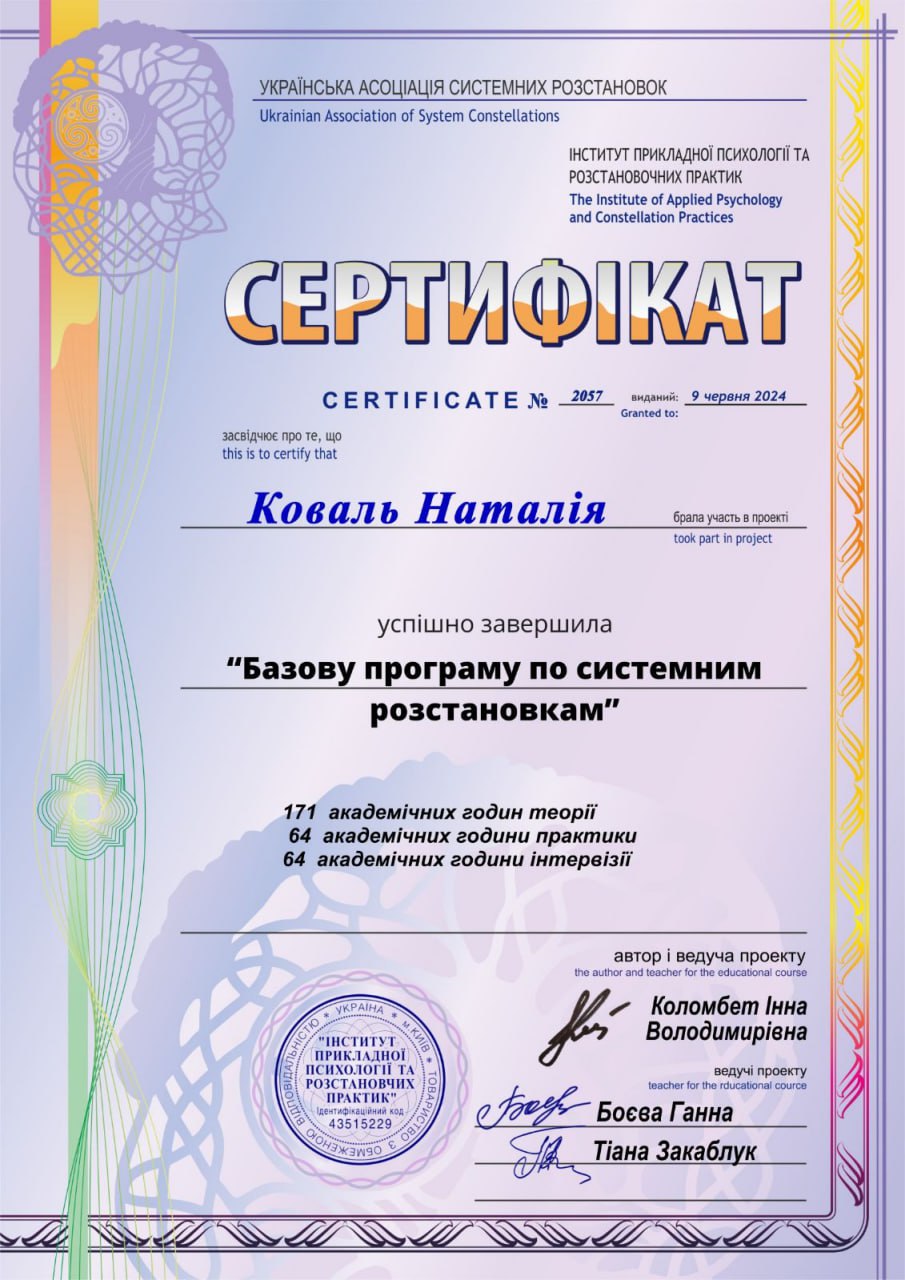 - Сертифікований фахівець-розстановник.