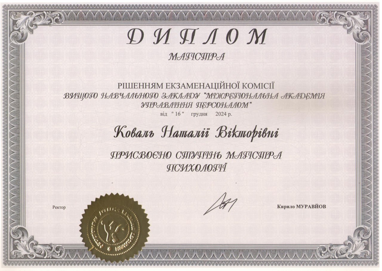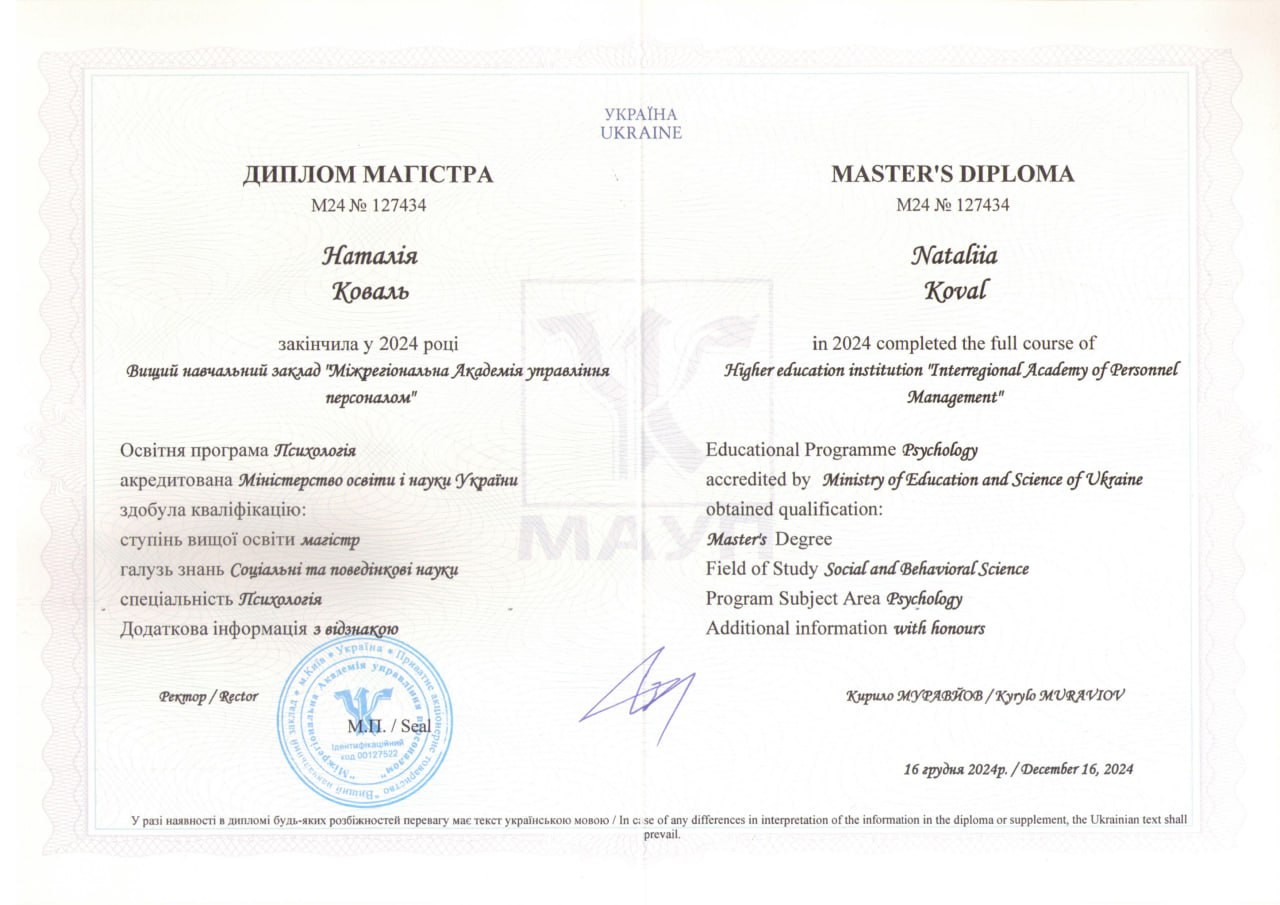 2022-2024 - Міжрегіональна академія управління персоналом, диплом магістра з відзнакою зі спеціальності "Психологія" - 2022 - 2024 - навчання за програмою “Системно-феноменологічна терапія та системні розстановки”. Міжнародний інститут психоаналізу і Системного консультування. (344 ак.г)
