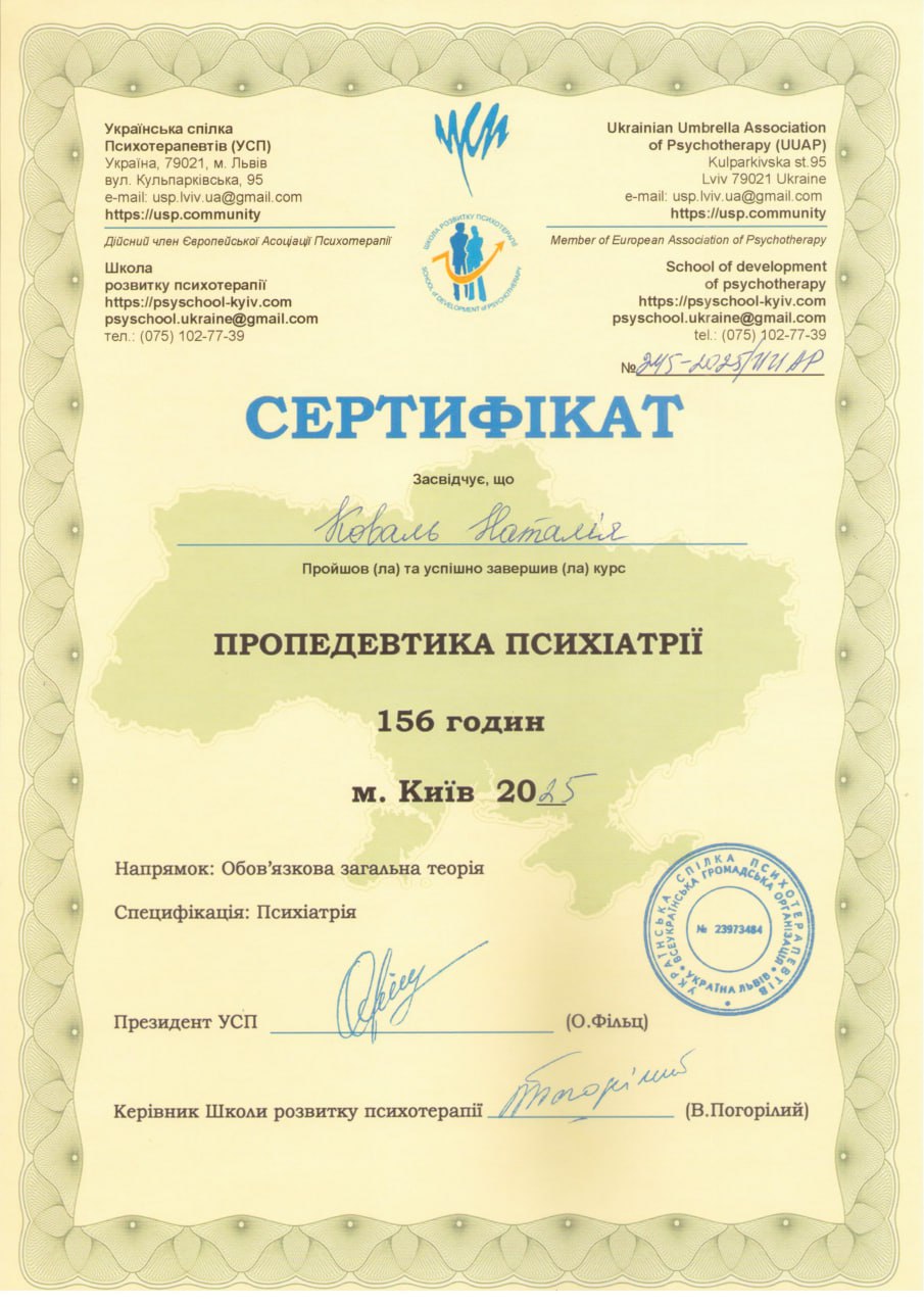 2025 - навчання за програмою "Пропедевтика психіатрії" у Школі розвитку психотерапії.