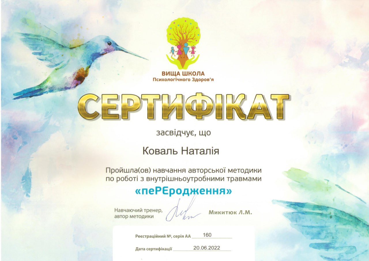 2022 - сертифікований тренер у роботі із внутрішньоутробними травмами "Переродження"