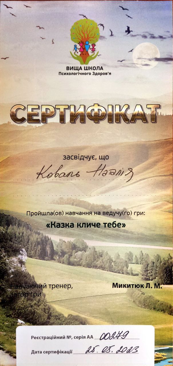 - Сертифікований фахівець у роботі із психічною травмою.